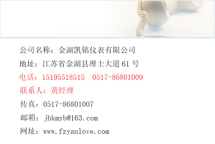 金湖凱銘儀表有限公司是一家生產儀器儀表廠家。本公司將以優質的產品、優惠的價格、歡迎新老客戶誠信合作。聯系電話:15195518515 黃經理
