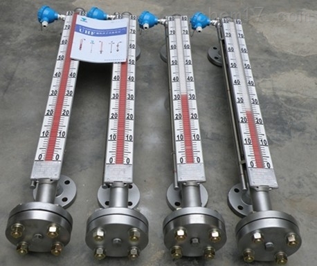 液位計根據浮力原理,浮子在測量管內隨液位的升降而上下移動,浮子內的永久磁鋼通過磁耦合作用,驅動紅、白色翻柱翻轉180’液位上升時,翻柱由白色轉為紅色,下降時,翻柱由紅色轉為白色,從而實現液位的指示。
