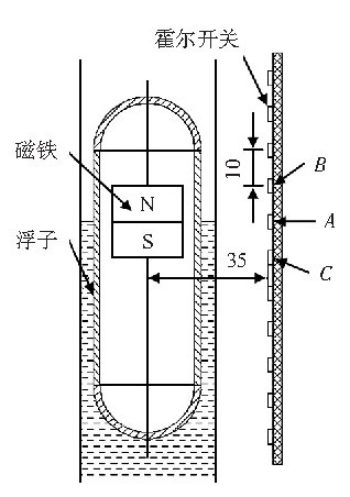 算出磁性浮子的磁場分布,根據(jù)測量精確度、霍爾開關(guān)的磁場強(qiáng)度閡值、霍爾開關(guān)到浮子的距離等己知條件計算出浮子內(nèi)磁鐵的大小,簡化了工藝流程,減少了工作量。在程序設(shè)計時,