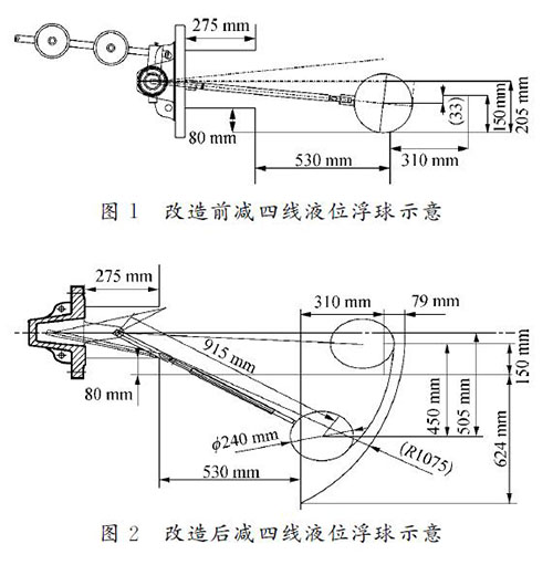 針對減四線液位測量進行大轉角、切割集油箱改造,有效量程大于設計量程的80%,其改造測繪圖如圖2所示。改造后,安裝支架120 mm,插入深度為1?。保担担恚恚瑢嶋H測量液位達450mm,儀表接液部位全部選用317材質。轉軸—杠桿套筒、杠桿套筒—連桿、浮球—連桿的固定連接節點及加工焊接坡口增加焊接強度;對于活動節點,采用專用銷子固定。