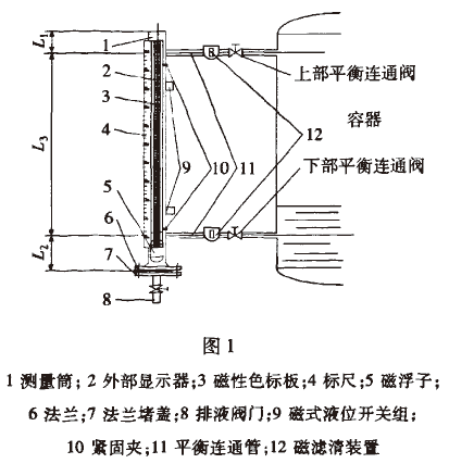 1測量筒;2外部顯示器;3磁性色標板;4標尺;5磁浮子;6法蘭:7法蘭堵盞;8排液閥門;9磁式液位開關組;10緊固夾;11平衡連通管;12磁濾清裝置元件上磁性材料的作用而發生翻轉。翻板或翻柱上涂有兩種視覺區分較大的顏色,觀看液位顯示器中翻板或翻柱的顏色分界線就可知容器中液位的情況。測量筒垂直方向的上下兩端安裝有閥門,其中上閥門用于平衡氣壓,下閥門用于放走殘留液體。
