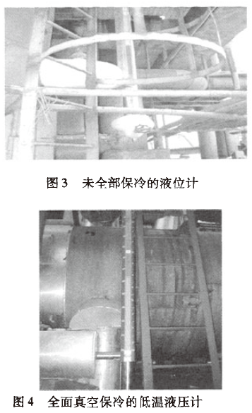 從圖3和圖4可見,平衡連通管無真空保溫層的液位計,有冷凝冰塊出現。加了之后,冷凝冰塊全部消失。