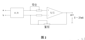 來自液位傳感器的對(duì)應(yīng)液位高度的電阻信號(hào),進(jìn)入圖2所示的a,b端,經(jīng)處理后*終輸出4~20mA DC標(biāo)準(zhǔn)信號(hào)。