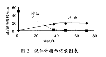 編程實現計算機畫面實時顯示油位(0% ~100%)和油位高、低的報警功能。我們用差壓法測量貯罐油位,如圖6所示,開氣閥時,油位回落較快;關氣閥時,油位上升緩慢(每小時7%)。可以將工作油位高位設在65%,油位從該點升至*限高位(80%),用時估計為2h。工作油位低位在55%~60%處,預警時間將提前20s以上,工作控制油位整體提高也利于潤滑設備的安全。因此,設定油位低于60%作為關閉氣閥條件,高于65%作為打開氣閥條件,用雙位式調節法代替原來的延時選通位式調節,控制油位在一定范圍內。保留了原有油位故障處理程序。
