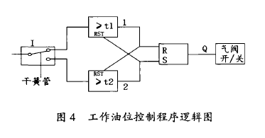 液位計筒體內徑d/~i0mm,標尺長750mm。750mm×20%=150mm,280÷750=37.3%),液位計油位滯后于貯罐油位變化。液位計回油時,浮筒漂向管口,則阻尼作用更強了,低油位*限開關LB/LVL6不能及時動作和關閉氣閥LB/EV2是造成貯油罐泄空而計算機未執行油位故障處理程序的原因。圖3 液位計故障剖析圖3.2 液位檢測開關和控制程序干簧管式接近開關本身依靠磁控開或合,易受周圍磁場干擾產生誤動。現場液位計安裝位置一側與電纜橋架相鄰,而另一側常有行車電磁吸盤吊裝鋼卷作業。從工作油位控制邏輯過程可以看出(圖4):盡管油位檢測開關已通,每15s(t1=t2=15s)內,只要存在一次脈沖干擾,開氣閥電路回路將未被選通。反之亦然。因此,干簧管式接近開關誤動產生錯誤控制,也是釀成事故的另一個原因。