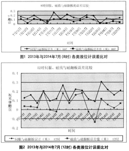 由以上兩圖得知,伺服液位計誤差值曲線較高,液位漲浮較大,計量誤差*髙達+0.3m,而磁致液位計誤差值曲線相對穩定,液位漲浮較小,計量誤差在±0.2m之間,較為精準。