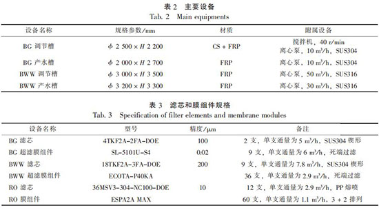 超濾膜組件和反滲透膜組件前均設置保安過濾器, 濾芯和膜組件規格參數見表 3。