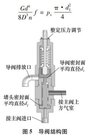 忽略重力和摩擦力因素的影響,對(duì)導(dǎo)閥的動(dòng)作過(guò)程進(jìn)行受力分析,導(dǎo)閥結(jié)構(gòu)如圖 5 所示。當(dāng)系統(tǒng)壓力升高達(dá)到整定壓力時(shí),氣體在導(dǎo)閥密封面處克服導(dǎo)閥彈簧預(yù)緊力向上頂起導(dǎo)閥的閥芯,此時(shí)應(yīng)滿(mǎn)足: