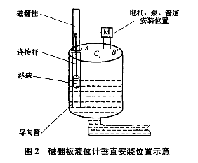 圖2中,B點靠近電機和泵,襯四氟磁翻板液位計安裝在此處既影響電機及泵的檢修,又因泵附近液位的環流波動較大,對浮子導向管沖刷嚴重,故B點不合理;C點處因有管道通過,不便維護且影響管道和泵、電機等的起吊更換,故也不能選擇C點;A點遠離泵和電機,且有足夠的空間安裝翻板,便于維護,所以A點較為合適。