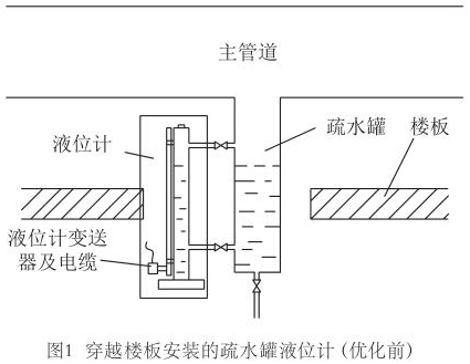 田灣核電3#、4#機組現(xiàn)場疏水罐液位測量*先采用兩個連通管把液位計測量筒與疏水罐連通,測量筒內(nèi)部含有磁浮子,磁浮子高度隨疏水罐內(nèi)液位變化,測量筒外部安裝測量桿,感受磁浮子高度,再通過下部變送器轉(zhuǎn)化成電流信號輸出到DCS系統(tǒng)。一些蒸汽管道安裝布置貼近地面,疏水罐穿越樓板,這樣就使液位計安裝后變送器位于樓板下部,即下一層廠房的房頂;如圖1所示。