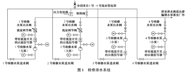 桐柏電站的檢修排水系統(tǒng),共設(shè)4臺排水泵,如圖1所示,1號、2號檢修水泵(大泵)用于排空引水隧洞、蝸殼、尾水管、尾水隧洞內(nèi)的水;3號、4號檢修水泵(小泵)用于球閥、上下庫閘門等的滲漏排水。每臺檢修水泵均配置逆止閥、壓力表和帶流量開關(guān)的示流信號器,在1號、2號水泵出水管處各安裝了一個流量調(diào)節(jié)閥。系統(tǒng)中共有2根總管,一根為水泵的總吸水管,包括從每臺機組尾水管底部至總管的支管,總吸水管和部分支管及管路上的操作閥門布置在廠房管路廊道中;另一根為總排水管,可將水排至滲漏集水井中,再經(jīng)滲漏排水泵排至下庫。