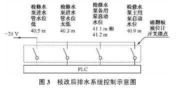 它結(jié)構(gòu)是利用旁通管的原理,主導(dǎo)管內(nèi)的液位和尾水管內(nèi)的液位高度一致,根據(jù)阿基米德定理,磁性浮子在液體中產(chǎn)生的浮力和重力平衡,當(dāng)尾水管中的水位升降時,液位計主導(dǎo)管內(nèi)的浮子也隨之升降,浮子內(nèi)的永久磁鐵通過磁耦合驅(qū)動指示器內(nèi)的翻板指示器,當(dāng)液位上升或下降時,翻板指示器由白色翻轉(zhuǎn)為紅色,或由原來的紅色翻轉(zhuǎn)為白色,指示器的顏色改變的高度就是被測水位的實際高度,從而實現(xiàn)液位的現(xiàn)場指示,以供運行人員目測尾水管的實時水位。安裝于液位計管壁外側(cè)的磁記憶開關(guān),可多點設(shè)置、滑動調(diào)整位置,提供了液位開關(guān)量報警功能。在裝置的頂部安裝了一個自動排氣裝置,當(dāng)主導(dǎo)管內(nèi)液位上升時能夠自動的排氣,下降時能夠按時補氣。現(xiàn)場安裝耐高溫磁翻板液位計時,裝置標(biāo)尺的0位,對應(yīng)的實地高程為EL.40.0m。浮子開關(guān)設(shè)定5個水位動作值,檢修水位低開關(guān)量報警值對應(yīng)的高程為40.3m;停止所有檢修水泵的開關(guān)量,所對應(yīng)的高程為40.5m;啟動主用檢修水泵的開關(guān)量,所對應(yīng)的高程為40.9m;啟動檢修水泵主用泵的開關(guān)量,以及要求手動啟動大泵,并作為水位高報警上送上位機,所對應(yīng)的高程為41.1m與41.2m,兩個開關(guān)量并列接入。全部開關(guān)量分別送入PLC,如圖3所示。