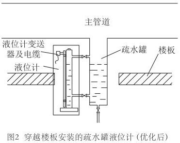 液位計(jì)測(cè)量桿反向安裝后,變送器和接線盒位于樓板上部,反裝后示意圖如圖2所示。維護(hù)時(shí)變送器位于接近地面的位置,易于到達(dá),不存在高處作業(yè)風(fēng)險(xiǎn),不需要搭建腳手架,工作流程也能得到簡(jiǎn)化。