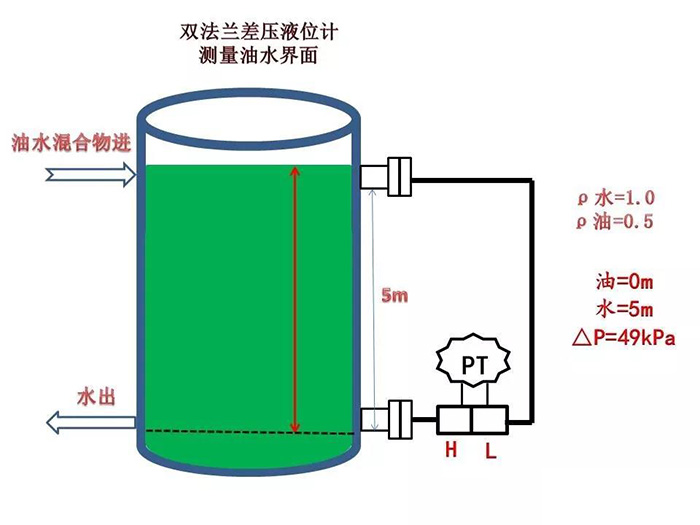 水的密度為1.0,油的密度為0.5,變送器的硅油密度為0.93,測量范圍5m,求油面在5m時(shí)變送器的差壓值。