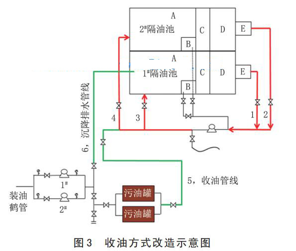 為延長含油污水沉降時間,提高分離效果,對隔油池進行流程改造。如圖 2 所示,A 為沉降池,B為 收 油 池 , C 為 集 水 池 , D 為 排 水 池 , E 為 緩 沖池。增加流程 1 至流程 4,含油污水在 1#隔油池沉降分離后,可通過流程 1、3 重新打入 1#隔油池,也可通過流程 1、4 打入 2#隔油池;含油污水在 2#隔油池沉降分離后,可通過流程 2、3 打入 1#隔油池,也可通過流程 2、4 重新打入 2#隔油池。隔油池流程可串聯(lián)或并聯(lián),實現(xiàn)了互聯(lián)互通。正常情況下,含油污水在 1#隔油池沉降分離后,通過流程 1、4 打入 2#隔油池,實現(xiàn) 2 個隔油池串聯(lián)使用。另外,在隔油池出口管線上連接耐腐蝕軟管,并將其固定在龍門架上,實現(xiàn)流程關(guān)斷,有效防止隔油池低液位卸車時油污直接沖進蒸發(fā)池。在蒸發(fā)池增設攔油繩,將污油聚集在有限范圍內(nèi),用臨時泵連接軟管將油污打入隔油池。通過以上措施,充分保證隔油效果,進蒸發(fā)池水質(zhì)清澈無油污。