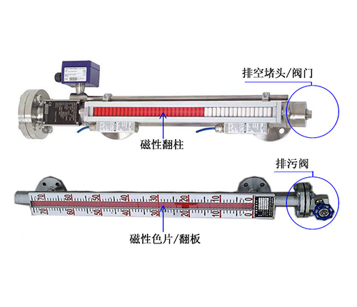 根據浮力原理,浮子在測量管內隨液位的升降而上、下移動,浮子內的永久磁鋼通過耦合作用,驅動紅、白色翻柱翻轉180°,液位上升時翻柱由白色轉為紅色,下降時由紅色轉為白色,從而實現液位指示。